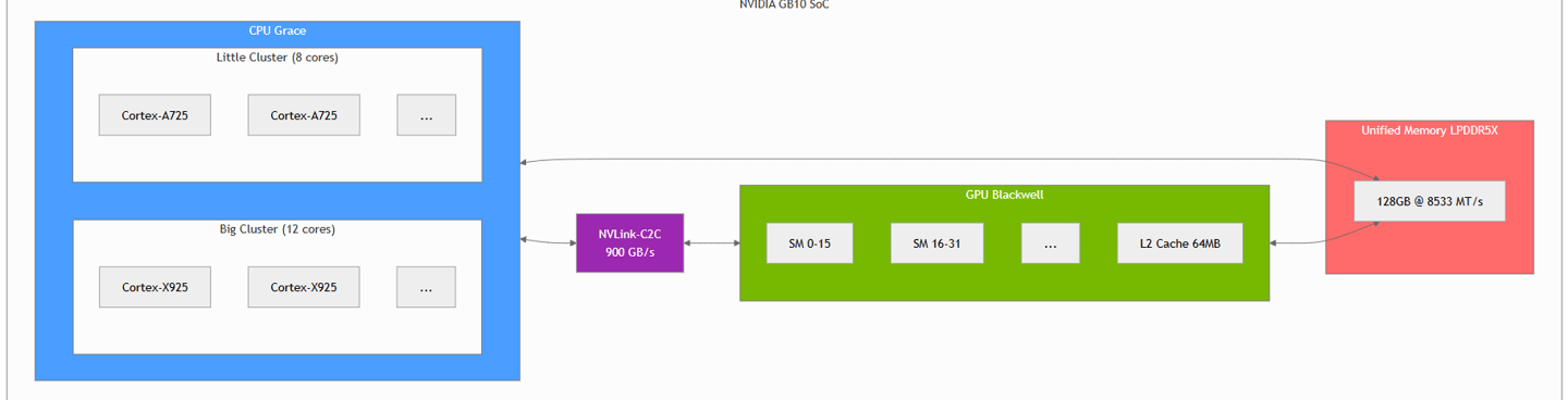 The NVIDIA GB10 combines an ARM Grace CPU and a Blackwell GPU on the same chip with coherent unified memory. This architecture eliminates data copies between CPU and GPU.